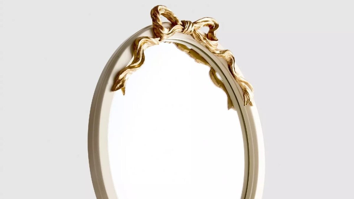 Lo specchio ovale rappresenta uno degli elementi più iconici della collezione. La cornice in bianco panna è volutamente sobria, quasi classica, per lasciare spazio al dettaglio decorativo: un fiocco dorato applicato nella parte superiore. Il risultato è un oggetto che richiama l’estetica boudoir ma si presta anche a contesti più contemporanei, dove può diventare un accento decorativo discreto ma riconoscibile. Ideale per ingressi, camere da letto o angoli vanity, questo specchio dimostra come il design decorativo possa convivere con la semplicità formale.