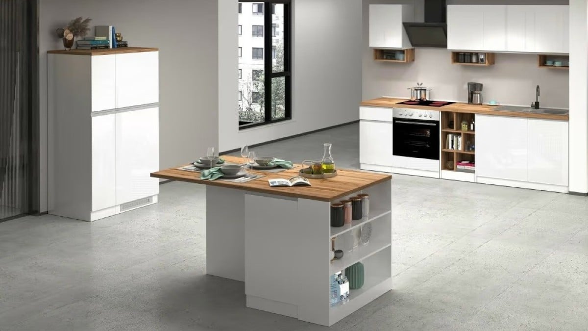 Abern di Dmora interpreta il concetto di isola multifunzione con un linguaggio pulito e luminoso. La finitura bianco lucido, accostata a inserti effetto rovere, lavora sulla riflessione della luce, contribuendo a rendere la cucina visivamente più ariosa. Le ante battenti custodiscono uno spazio interno pensato per la dispensa, mentre i vani a giorno offrono superfici utili per oggetti d’uso quotidiano o elementi decorativi. Il piano superiore diventa facilmente un punto snack o un tavolo informale, trasformando l’isola in un fulcro conviviale. Grazie alle proporzioni equilibrate, Abern si adatta anche a un soggiorno open space, dove può funzionare come elemento di separazione visiva.