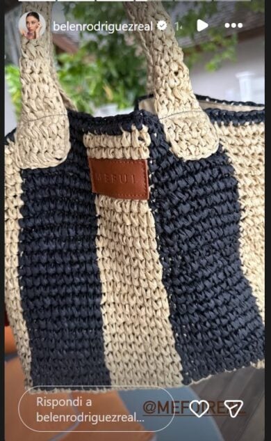 • Belen Rodriguez, al mare con la nuova borsa in paglia di Me Fui